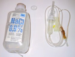 des Infusionssystems öffnen und den Schlauch mit Infusionslösung
