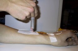angelegt (Oberarm). Nun sucht sich der Arzt eine geeignete Vene und desinfiziert